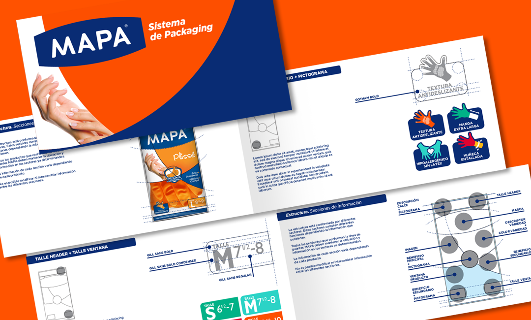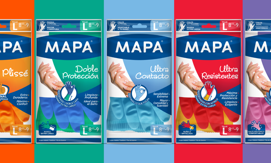 Desarrollamos un proceso de exploración de distintas propuestas de diseño y finalmente se definió una estructura de packaging que permitiera alinear todas las variedades de guantes Mapa que hasta ese momento tenán algunas inconsistencias entre sí.